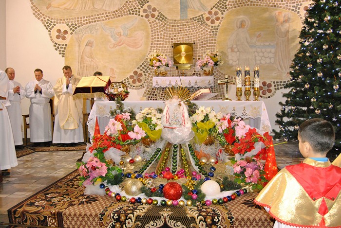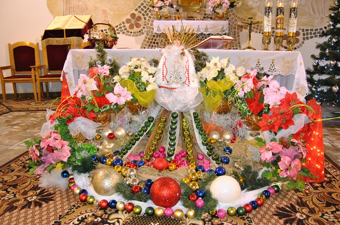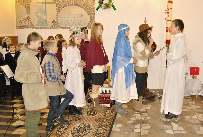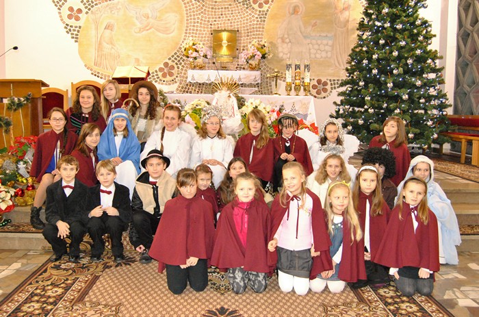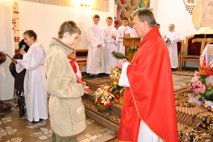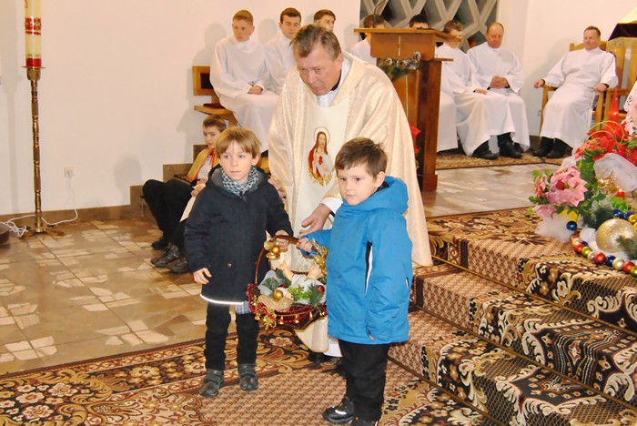 Dwójka najmłodszych Mikołajowiczan przenosi Dzieciątko z ołtarza do szopki: Stasiu Skórka /lat 4/ i Kacperek Boryczko /lat 6/